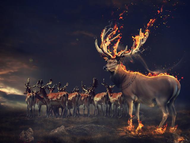 Обои Фантастический олень с огненными рогами и копытами