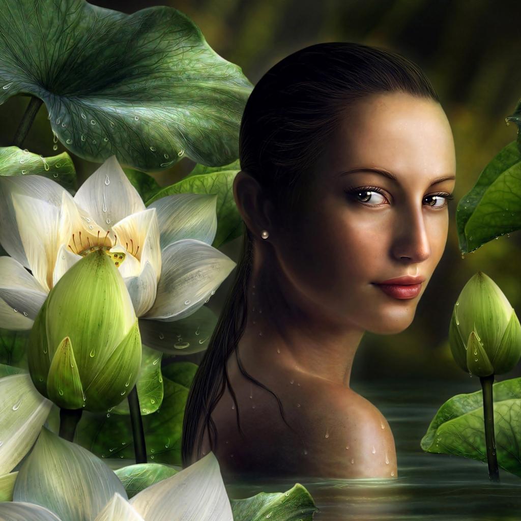 Обои Девушка фэнтези на фоне белых цветов лотоса