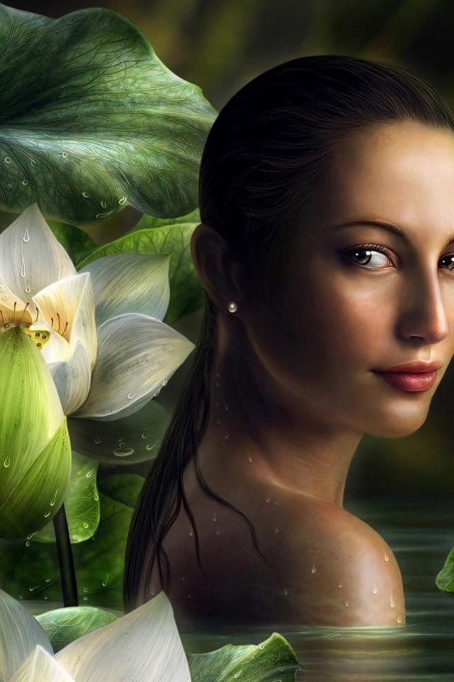 Обои Девушка фэнтези на фоне белых цветов лотоса