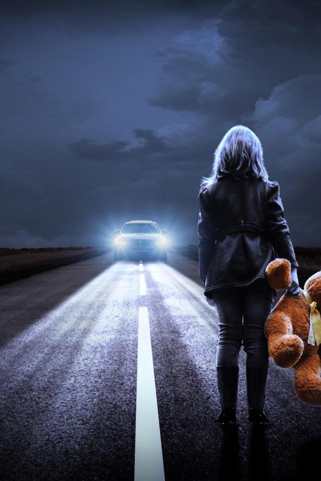 Обои Девушка стоит на дороге с игрушечным медведем