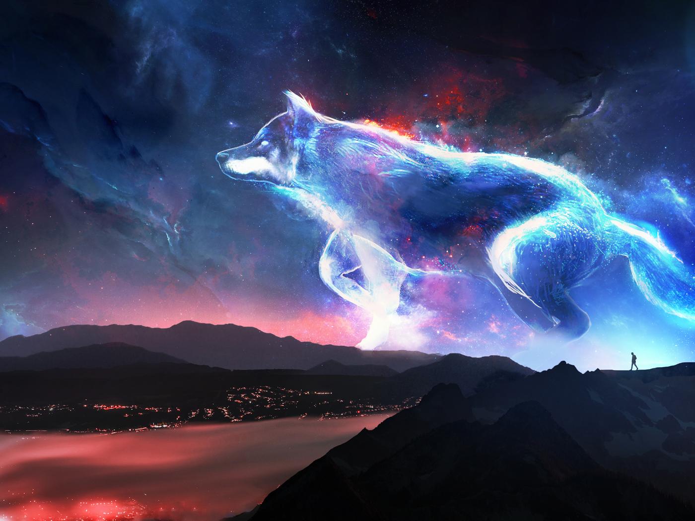 Обои Большой фантастический неоновый волк в небе, фэнтези