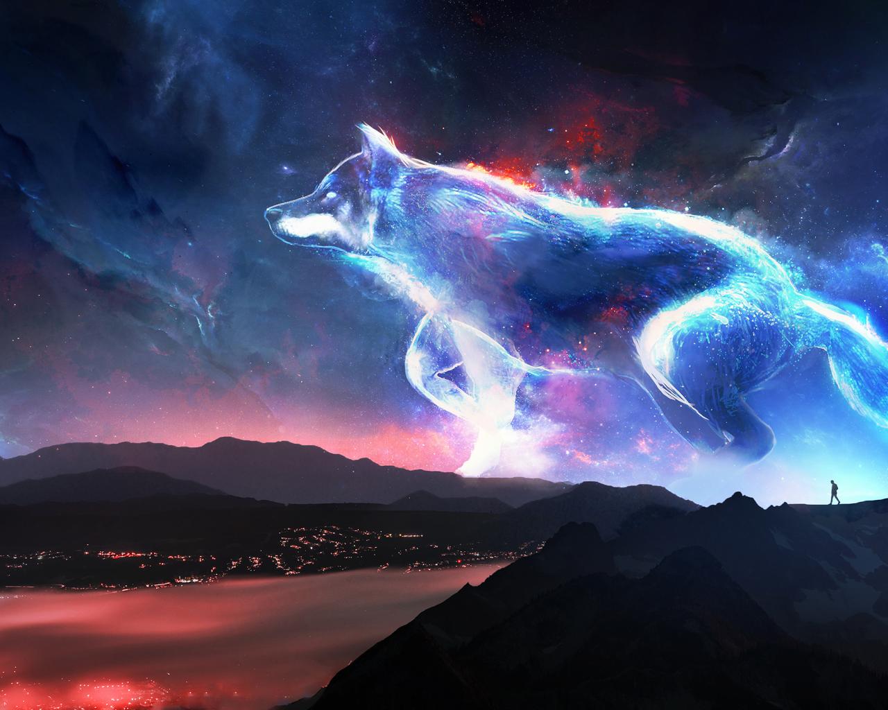 Обои Большой фантастический неоновый волк в небе, фэнтези
