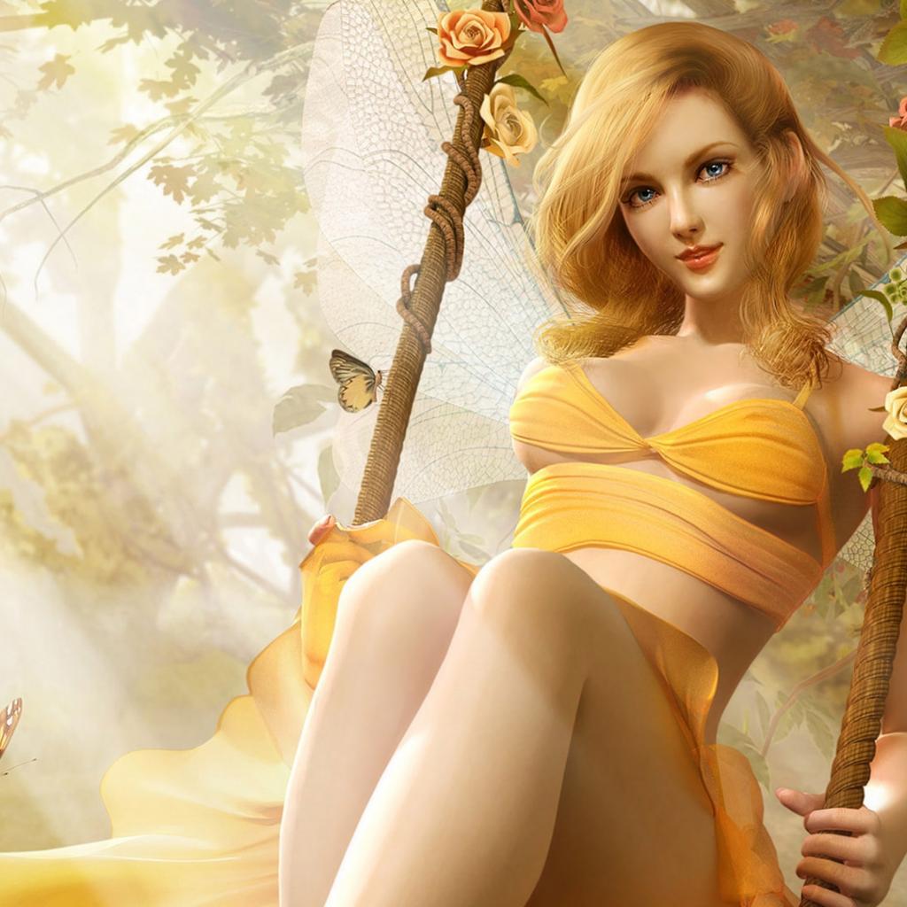 Обои Красивая девушка эльф катается на качели