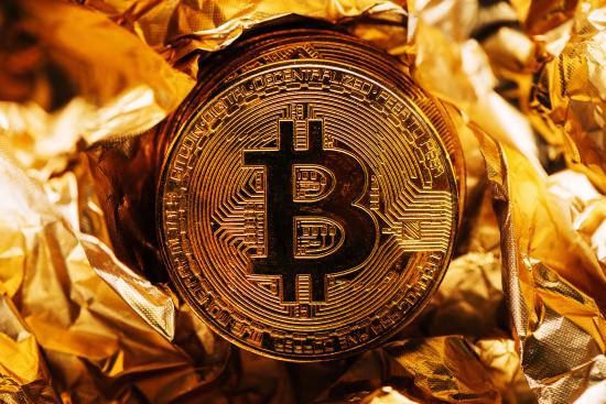 Обои Золотая монета биткоин на фольге