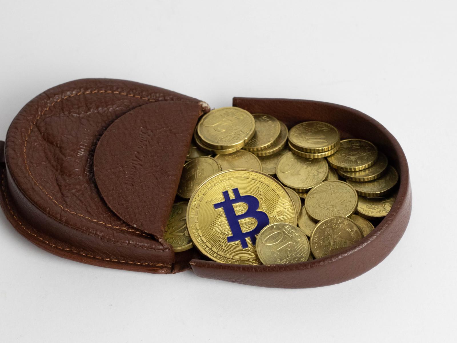 Обои Кожаный кошелек с монетами на сером фоне