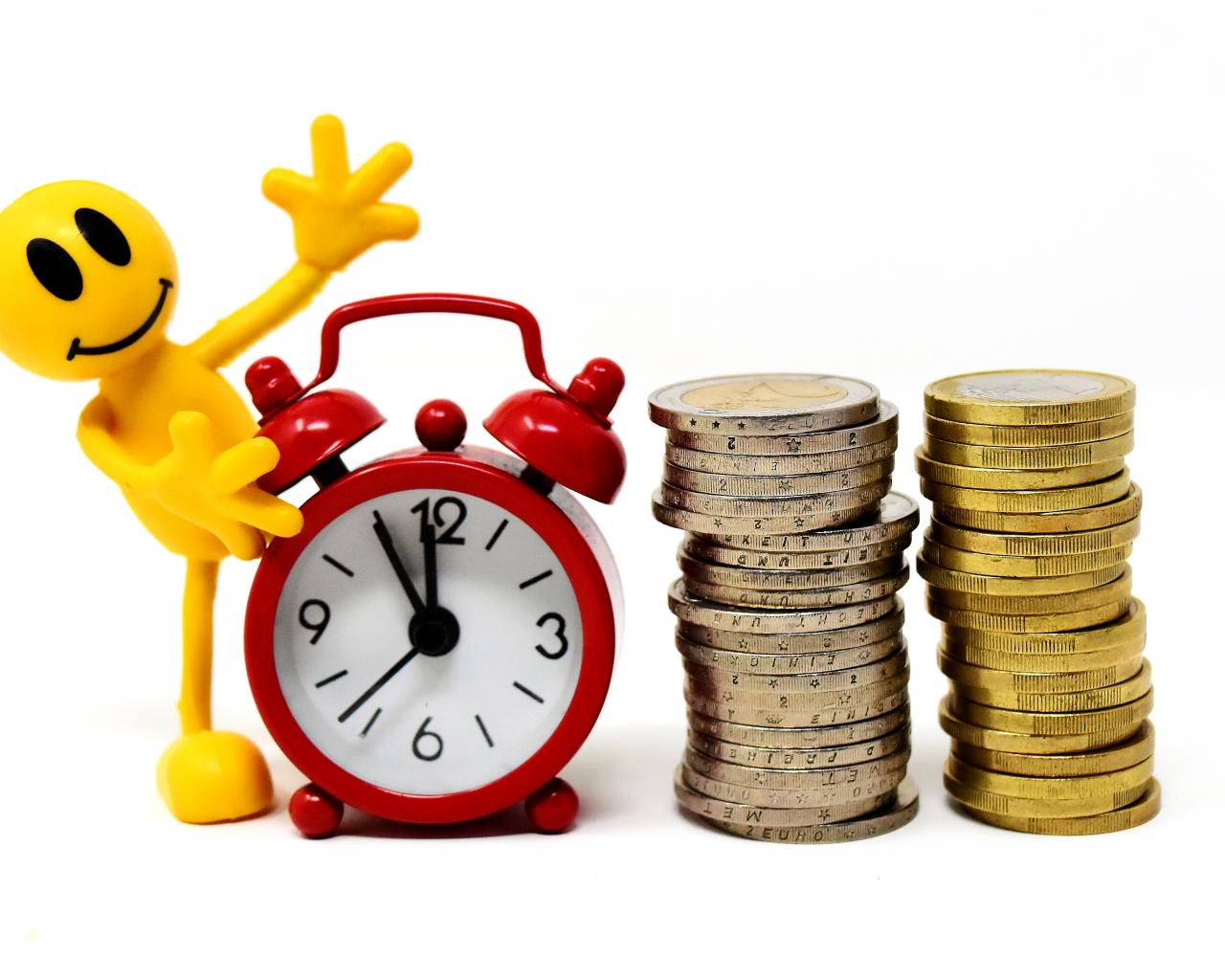 Обои Желтый человечек с будильником и монетами