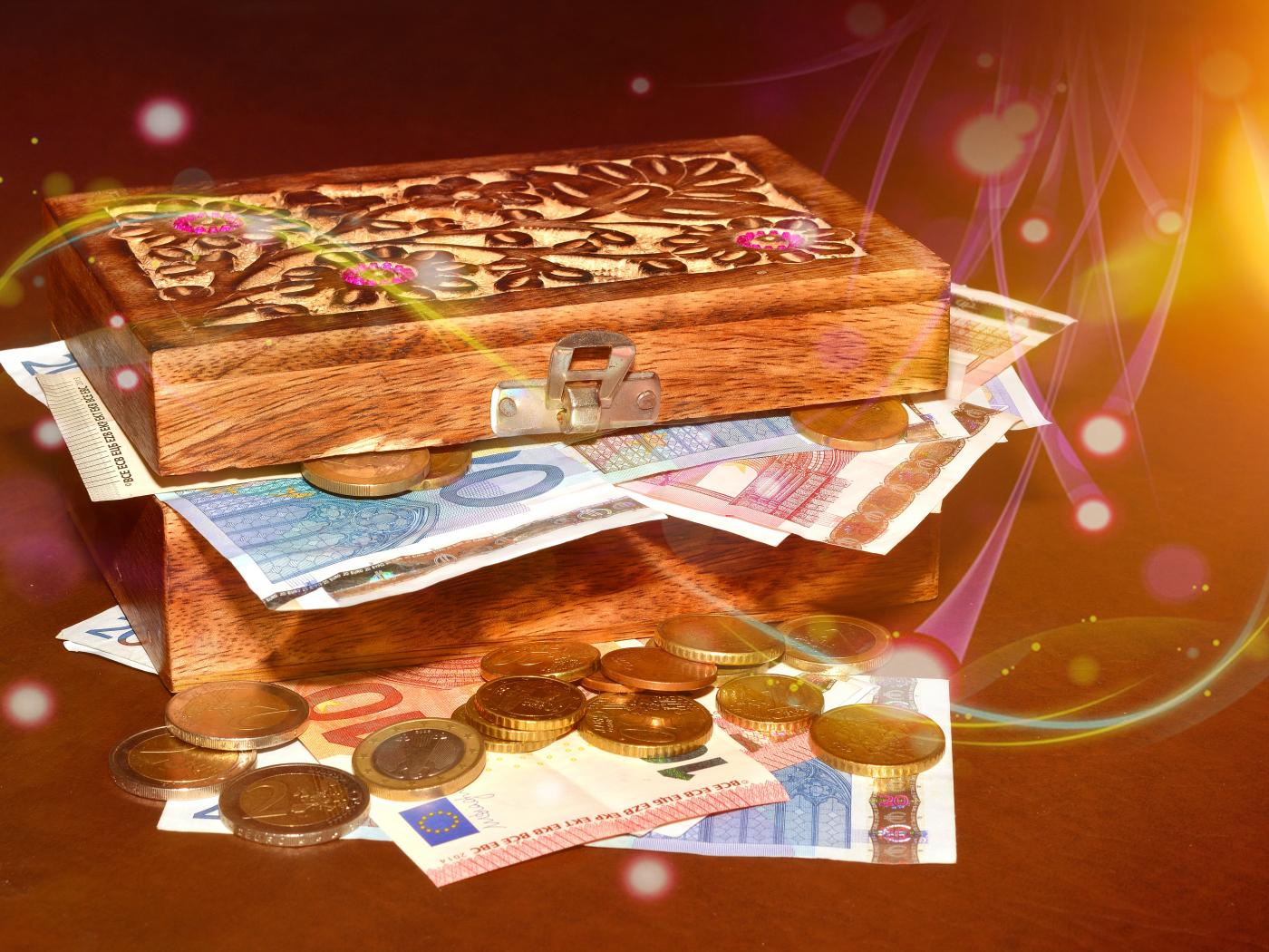 Обои Деревянный сундук с деньгами и монетами