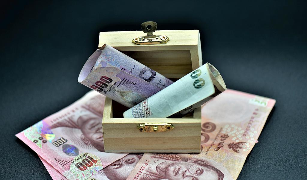 Обои Бумажные деньги на сером фоне с деревянной шкатулкой