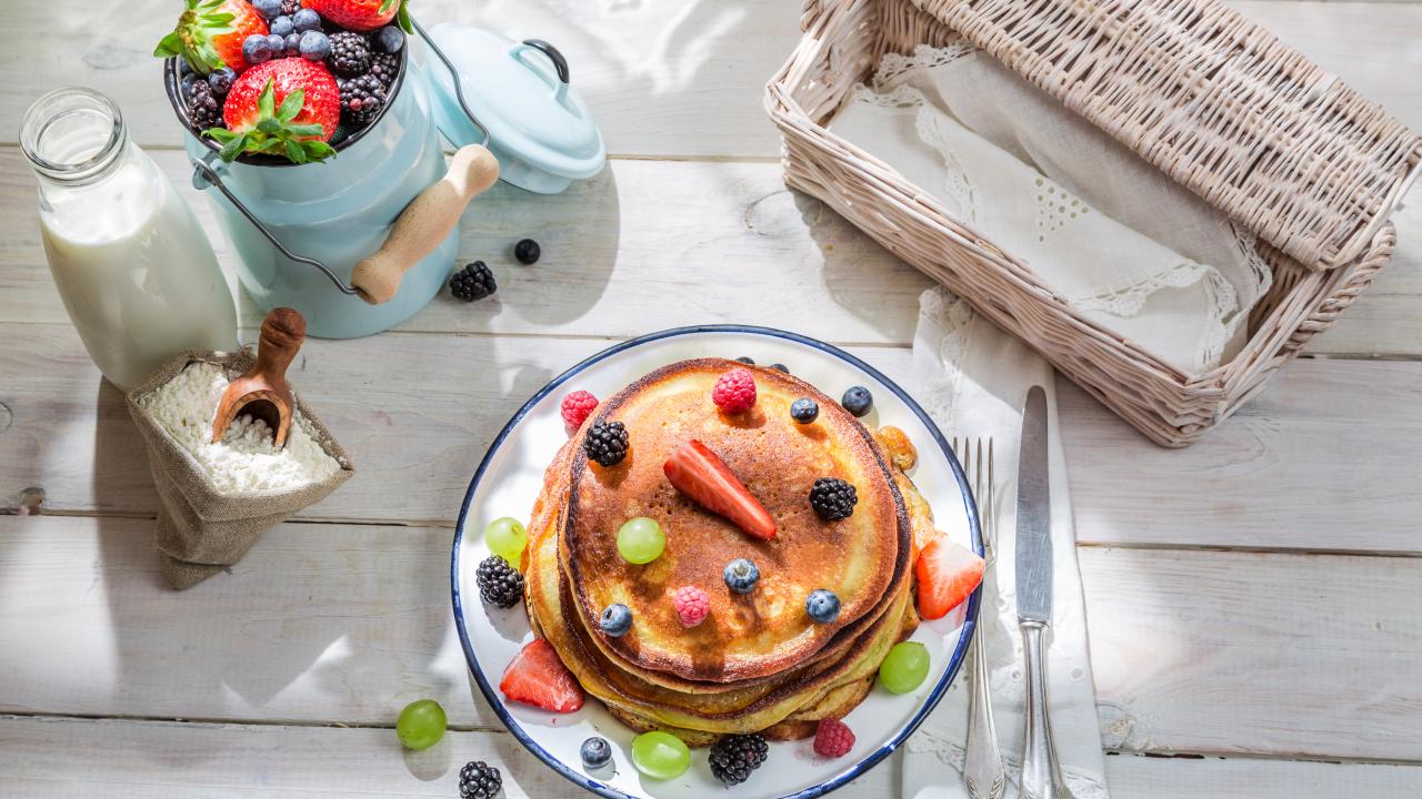 Обои Оладьи с ягодами и молочными продуктами на завтрак