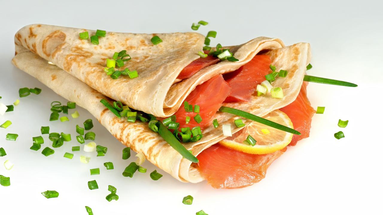 Обои Аппетитный блин с красной рыбой и зеленым луком