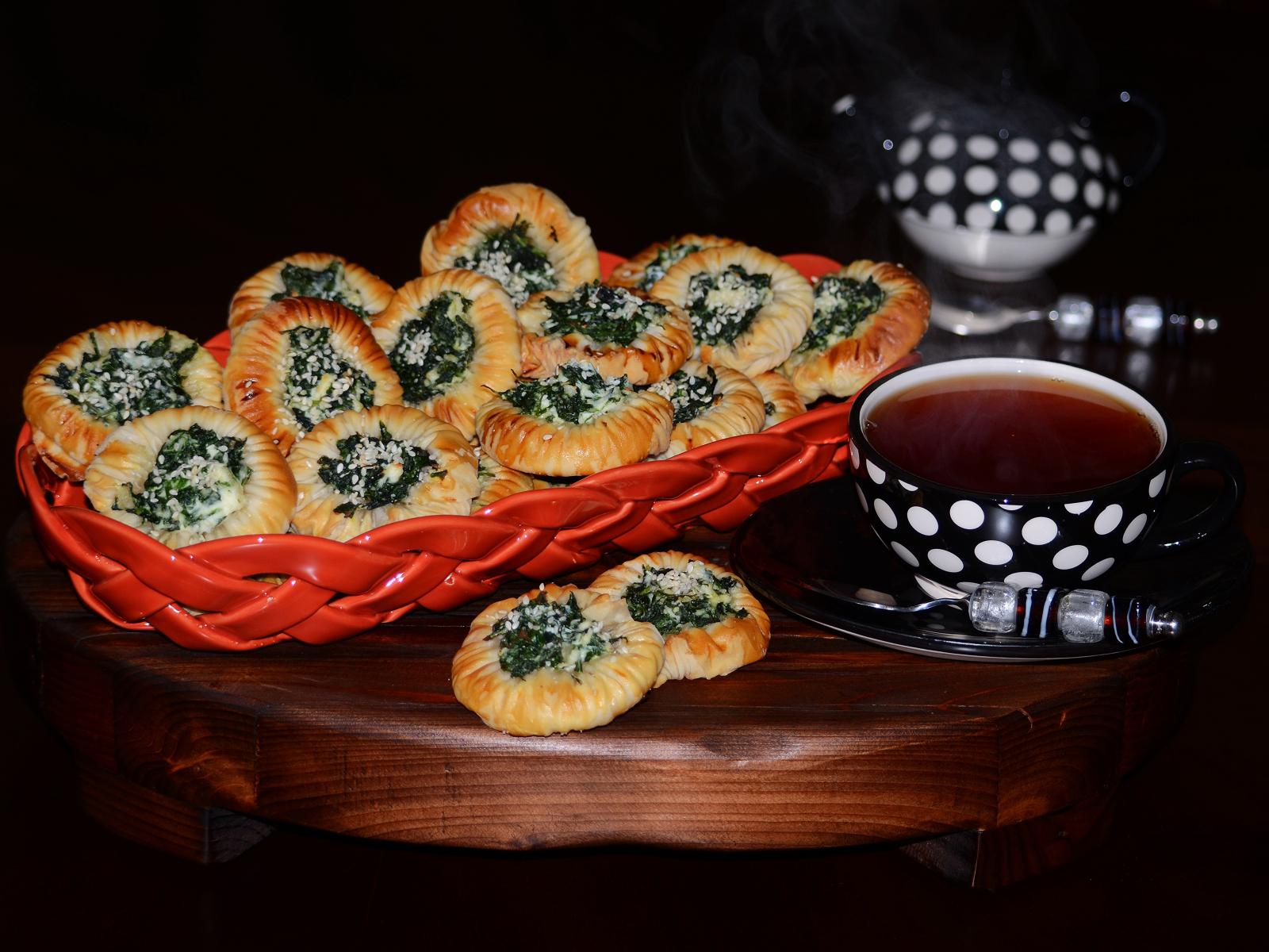 Обои Булочки с зеленью и горячим чаем на черном фоне