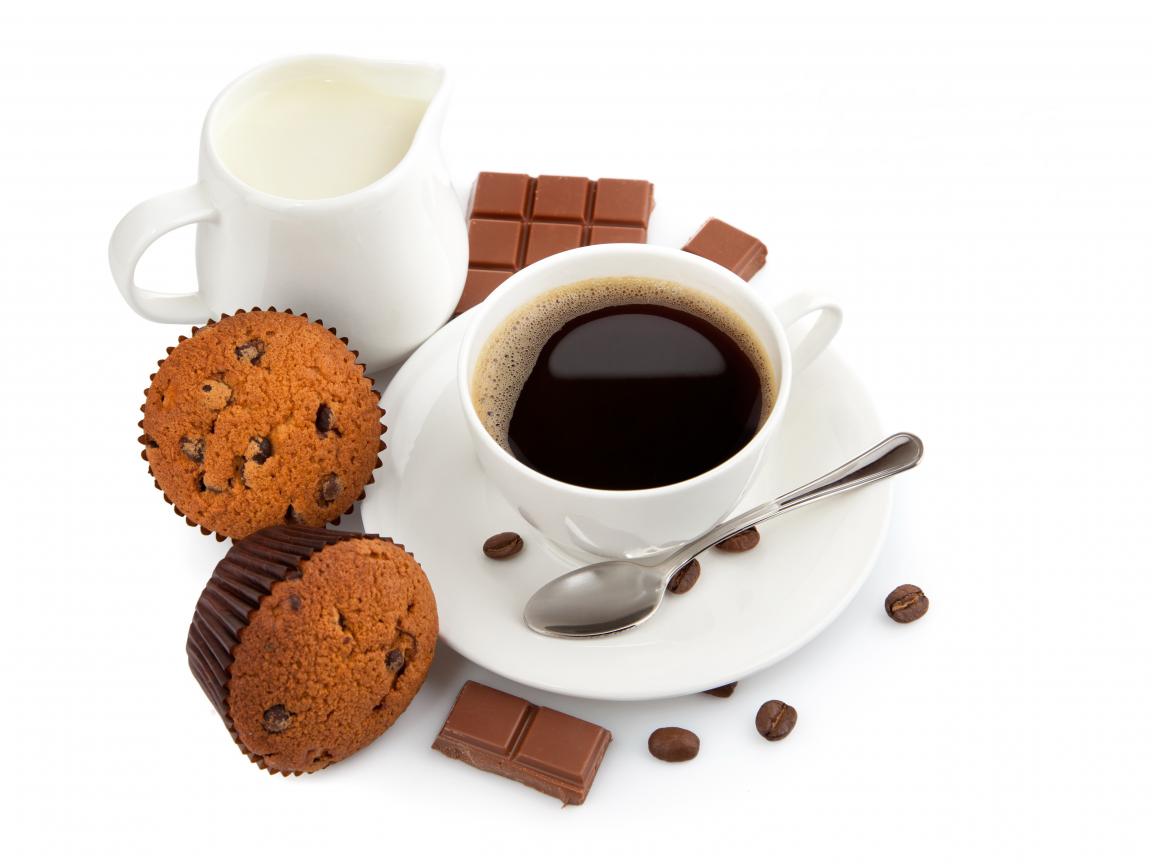 Обои Кофе с молоком, шоколадом и кексами на завтрак