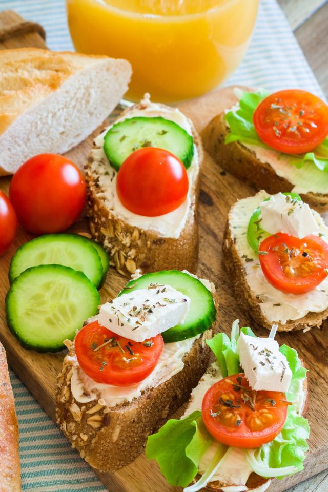 Обои Бутерброды с сыром огурцами и помидорами на завтрак