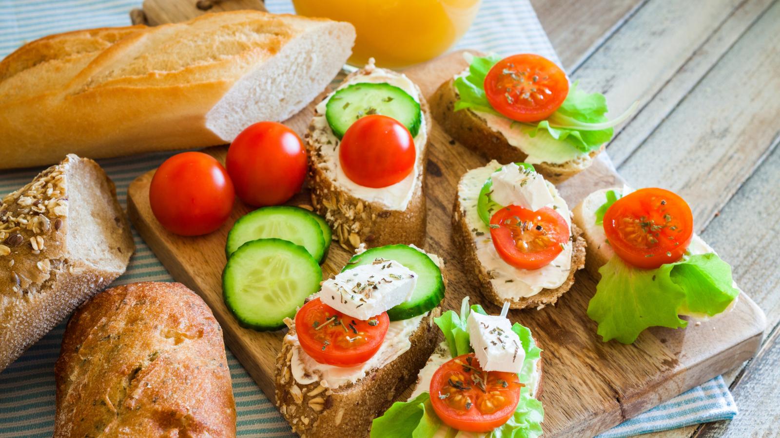Обои Бутерброды с сыром огурцами и помидорами на завтрак