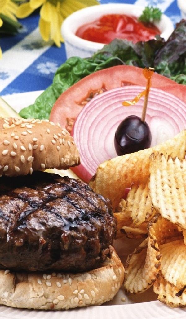 Обои Гамбургер с котлетой и картофельные чипсы на тарелке с овощами
