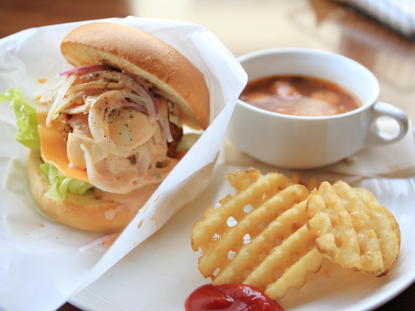 Обои Гамбургер картошка фри и чашка кофе на завтрак