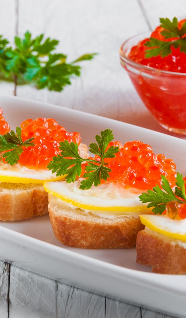 Обои Бутырброды с красной икрой и лимонами на белой тарелке