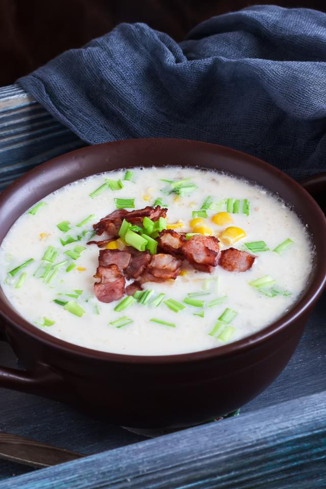 Обои Сырный суп с зеленью и беконом на столе с куском хлеба