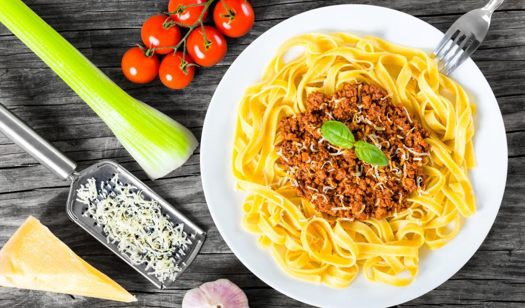 Обои Спагетти на белой тарелке с мясом и сыром