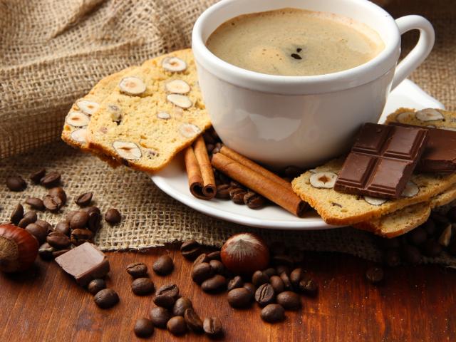 Обои Чашка кофе с выпечкой, кофейными зернами и шоколадом