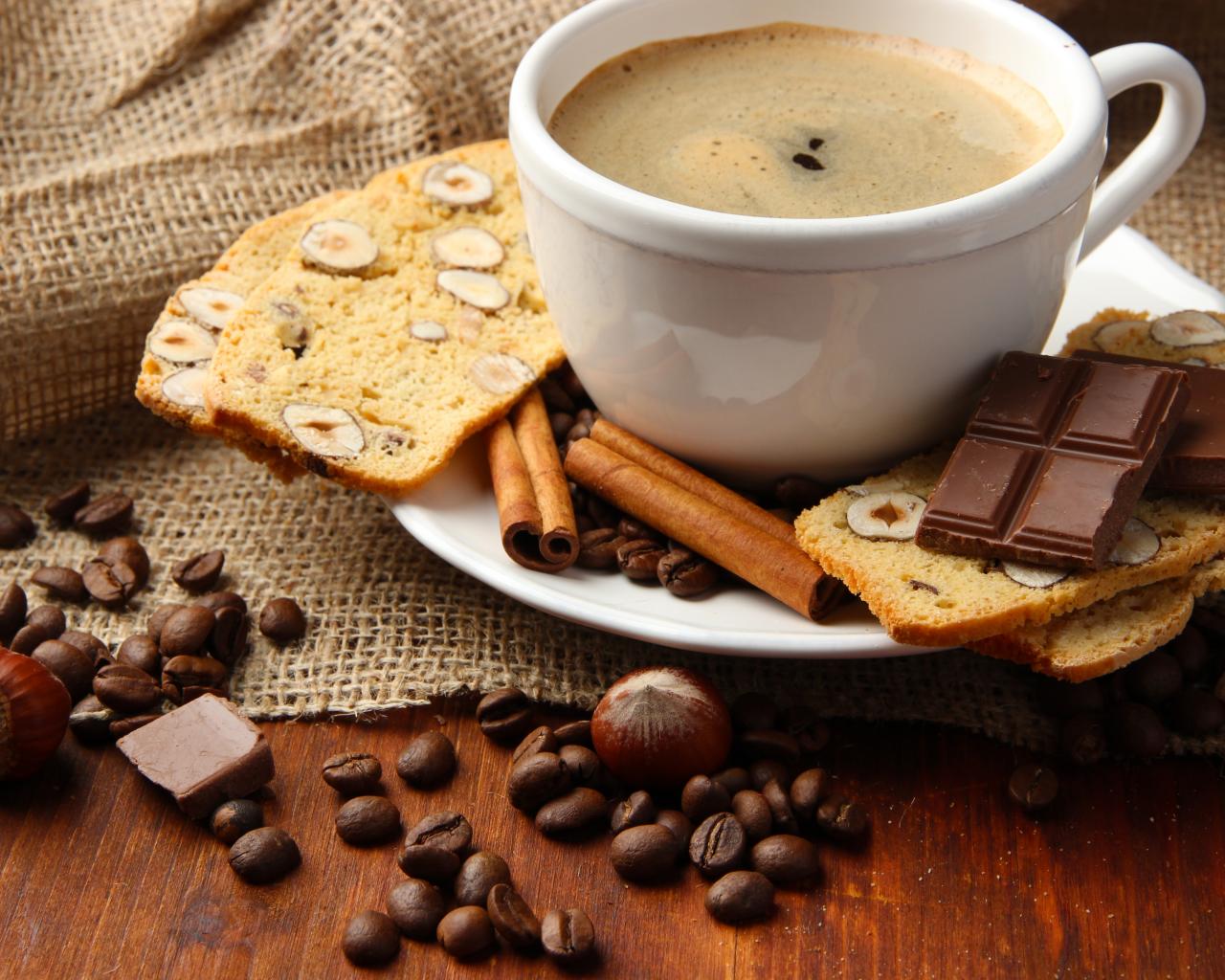Обои Чашка кофе с выпечкой, кофейными зернами и шоколадом