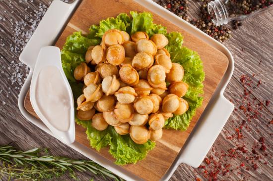 Обои Пельмени с соусом и листьями салата лежат на разделочной доске