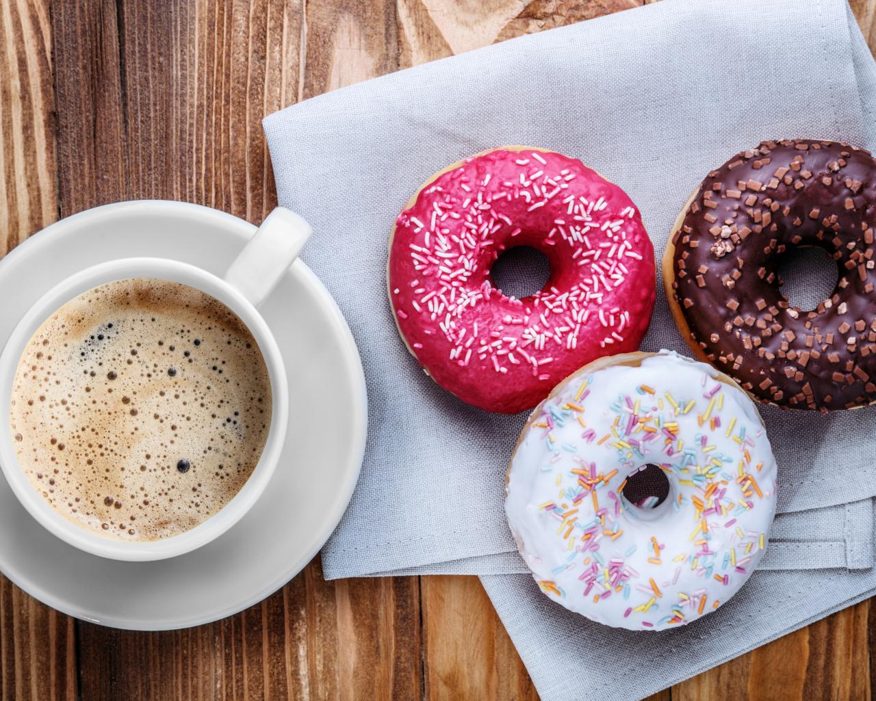 Обои Чашка кофе с тремя аппетитными пончиками на столе