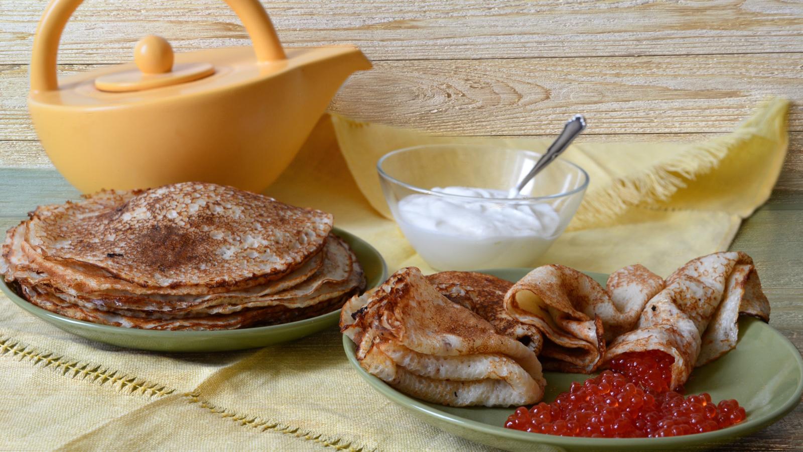 Обои Аппетитные блинчики со сметаной и красной икрой на столе