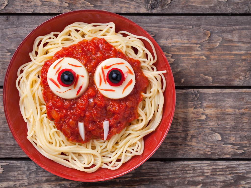 Обои Спагетти с соусом на красной тарелкой блюдо на Хэллоуин