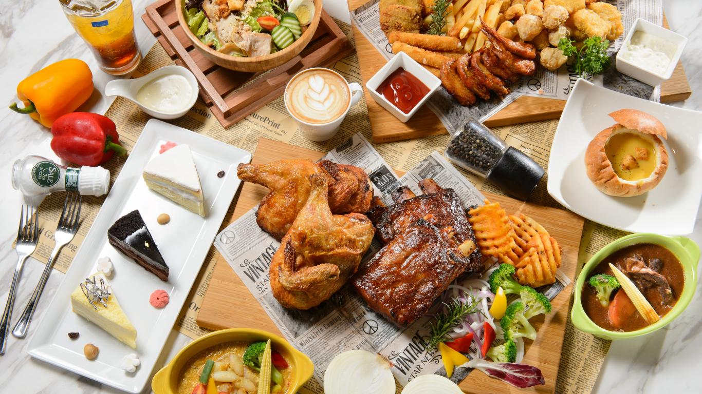 Обои Аппетитный натюрморт еды из фаст фуда на столе