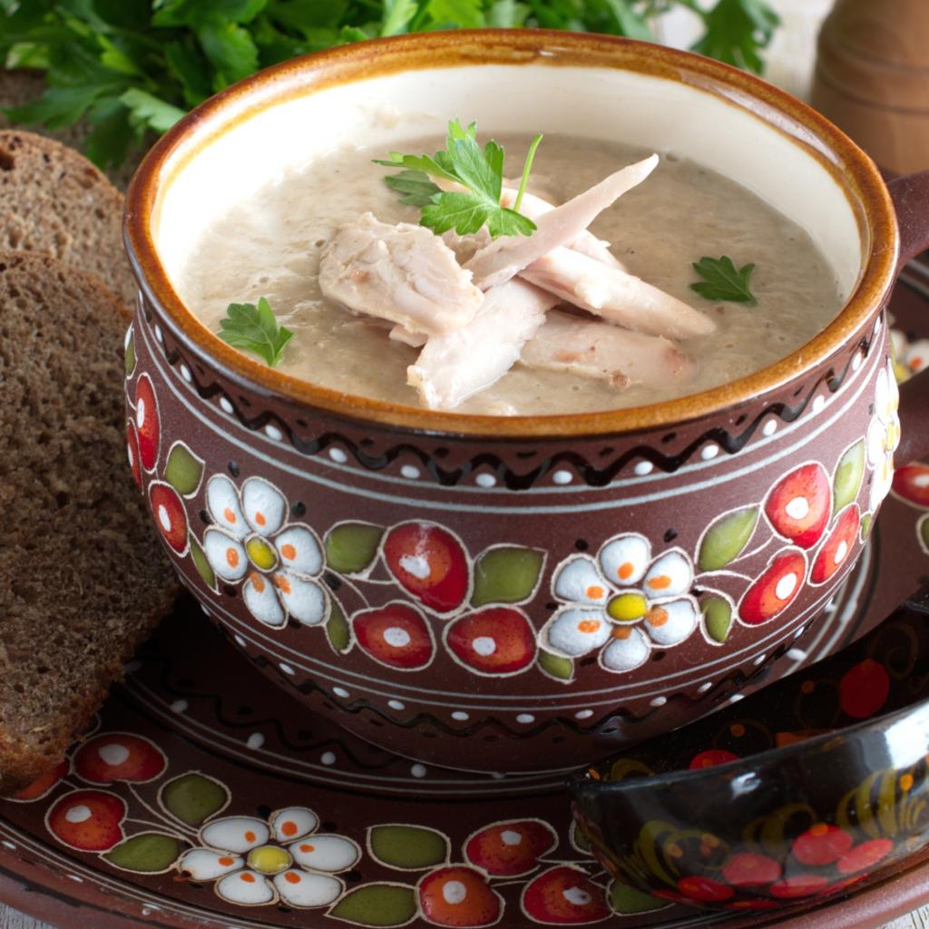 Обои Суп с курицей в красивой тарелке на столе с черным хлебом