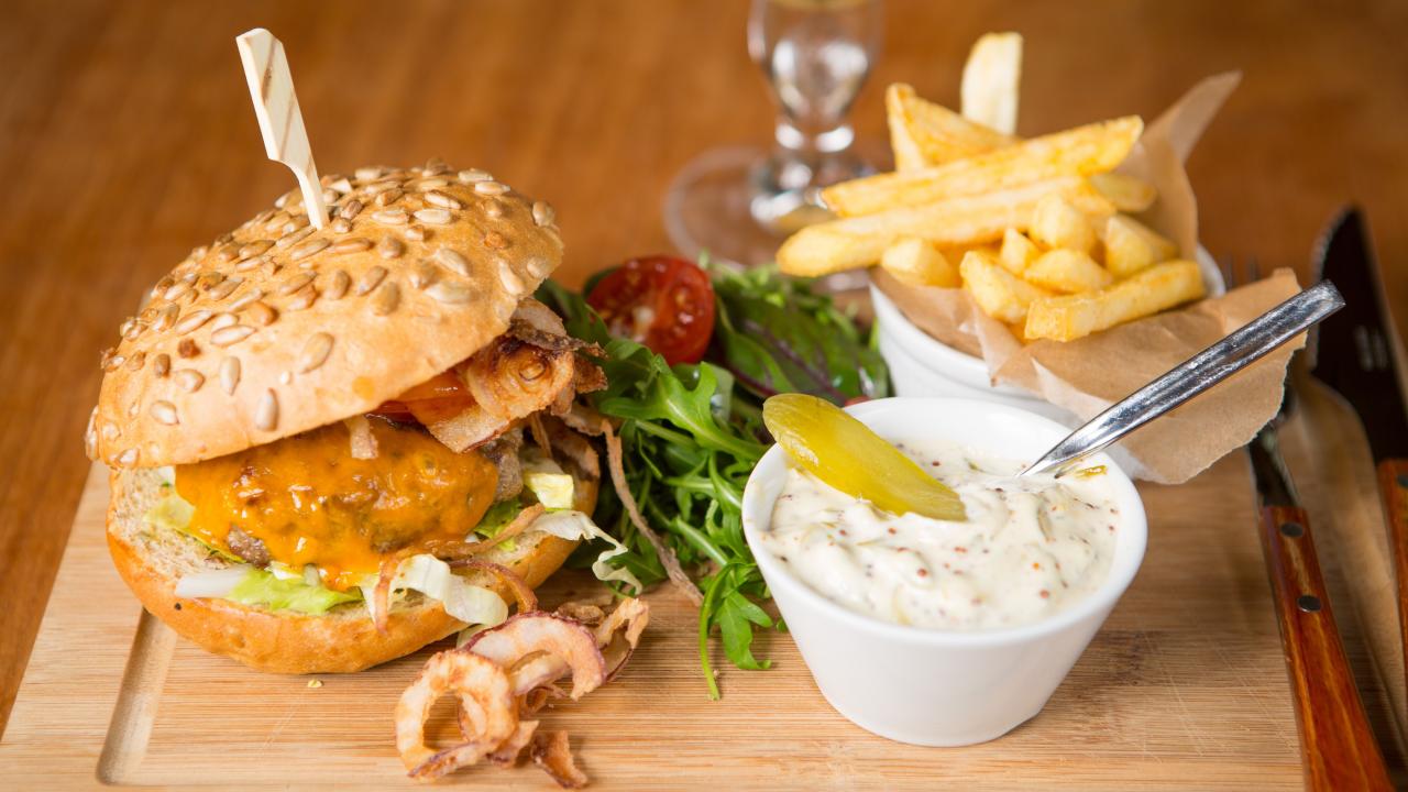 Обои Гамбургер и картошка фри на столе с соусом