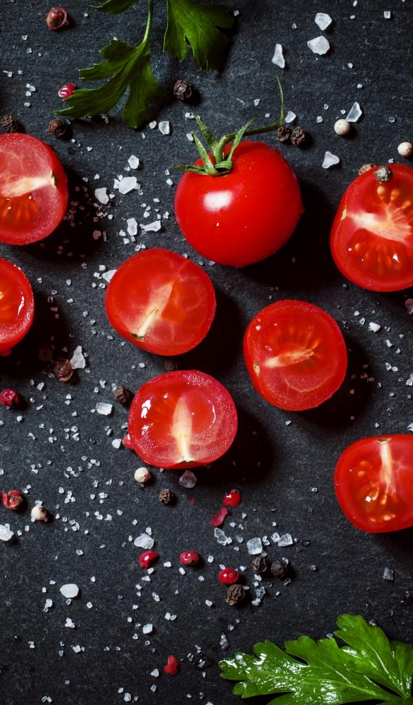 Обои Помидоры на столе с зеленью петрушки и специями