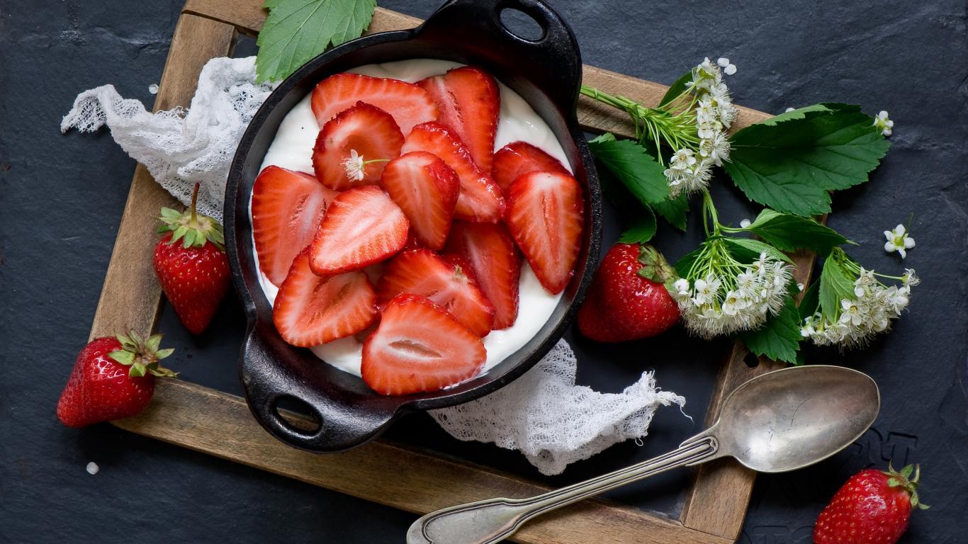 Обои Свежая клубника с йогуртом на завтрак на столе с белым цветком