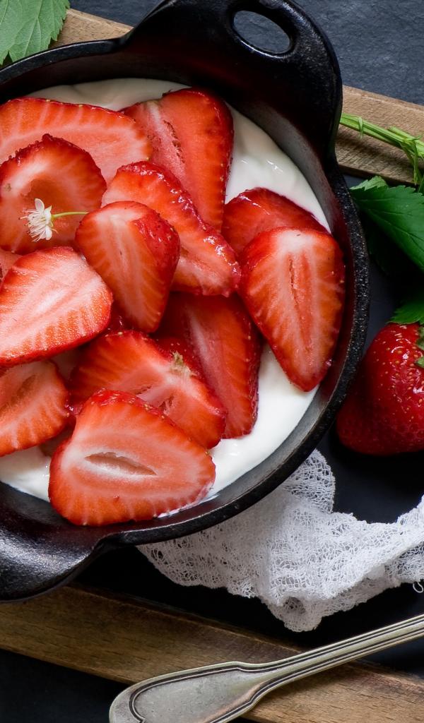 Обои Свежая клубника с йогуртом на завтрак на столе с белым цветком