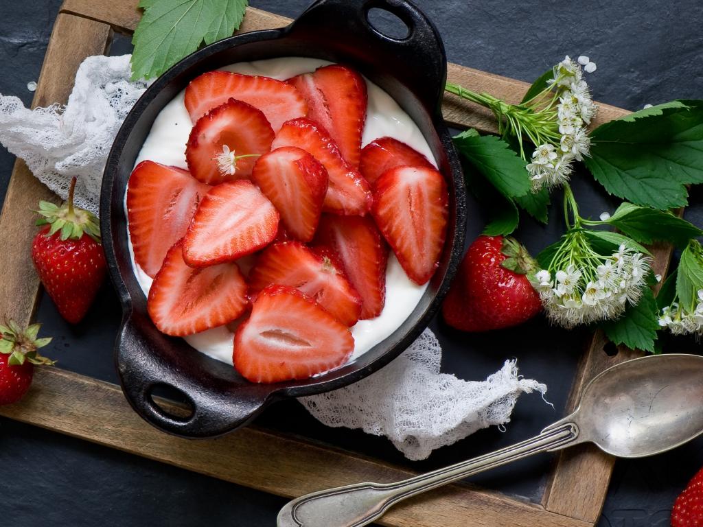 Обои Свежая клубника с йогуртом на завтрак на столе с белым цветком