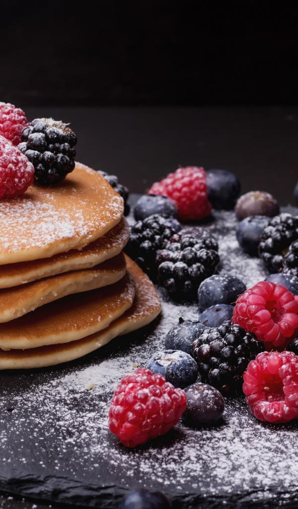Обои Вкусные свежие оладьи со свежими ягодами и сахарной пудрой