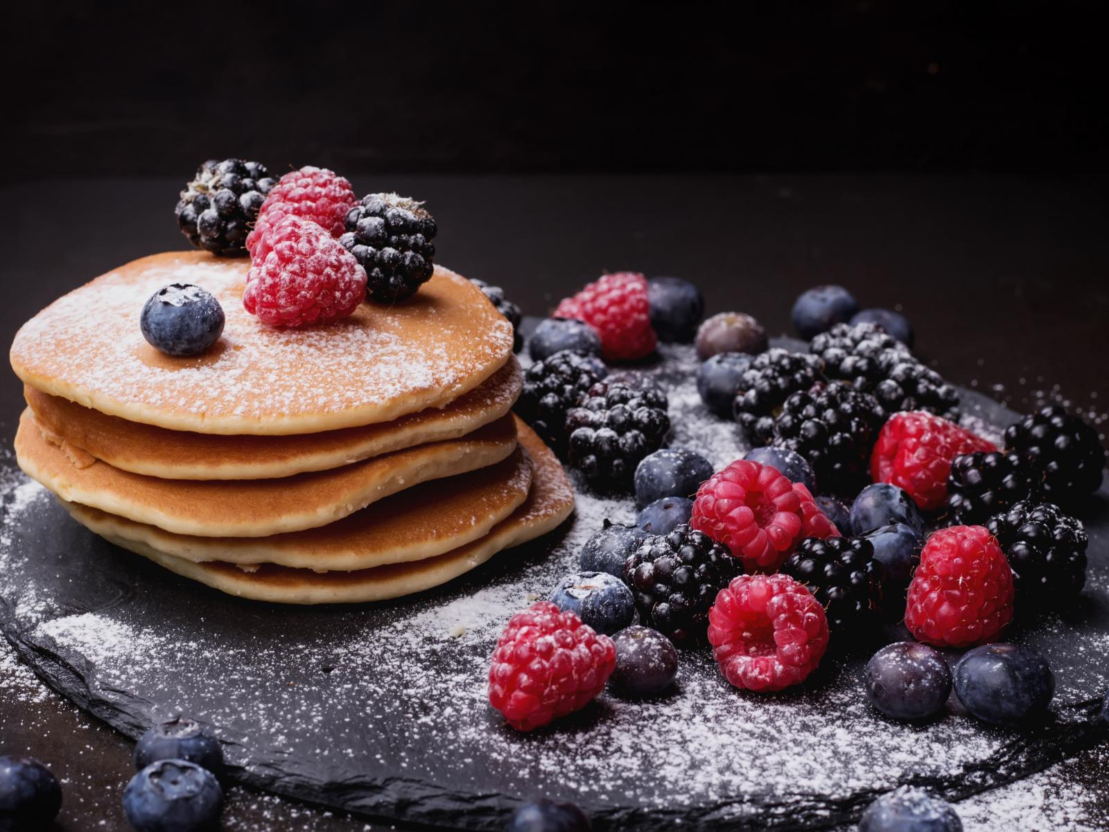 Обои Вкусные свежие оладьи со свежими ягодами и сахарной пудрой