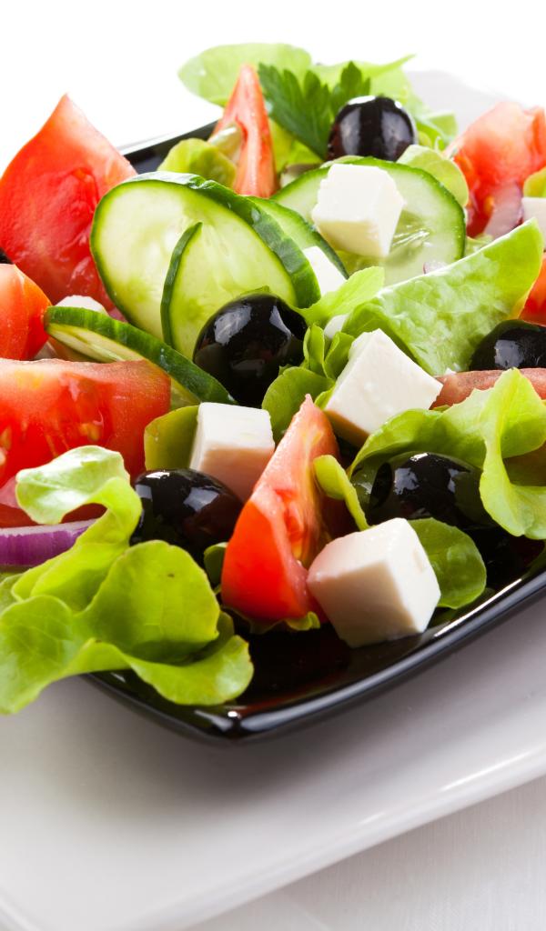 Обои Греческий салат с сыром, помидорами и огурцами на белом фоне