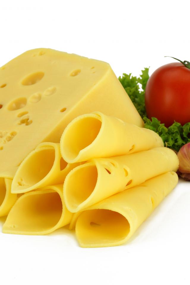 Обои Сырная нарезка с помидором, листьями салата и чесноком на белом фоне