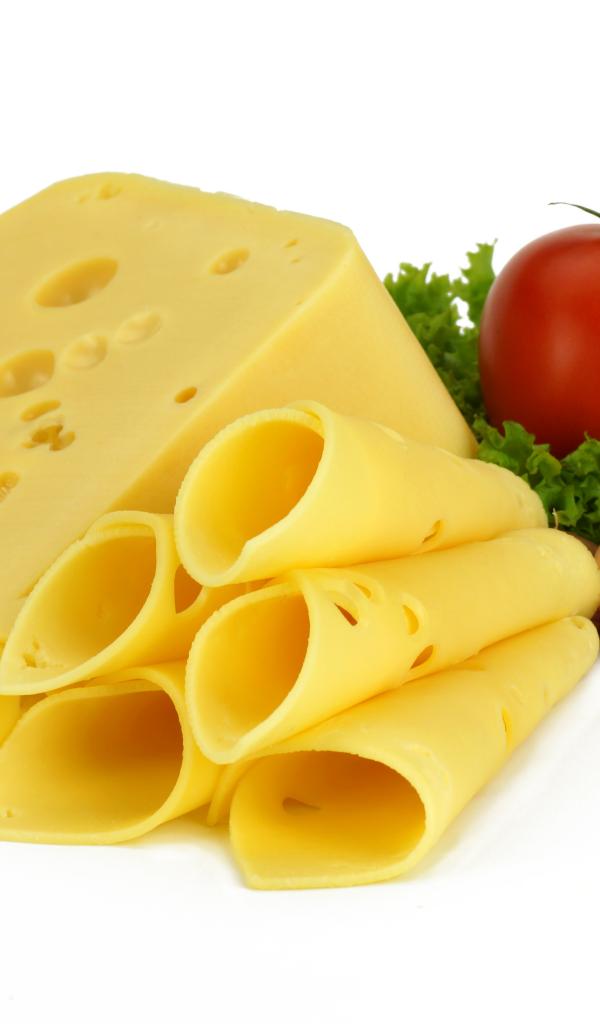 Обои Сырная нарезка с помидором, листьями салата и чесноком на белом фоне