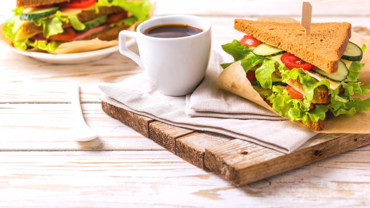 Обои Сэндвич на столе с чашкой кофе на завтрак