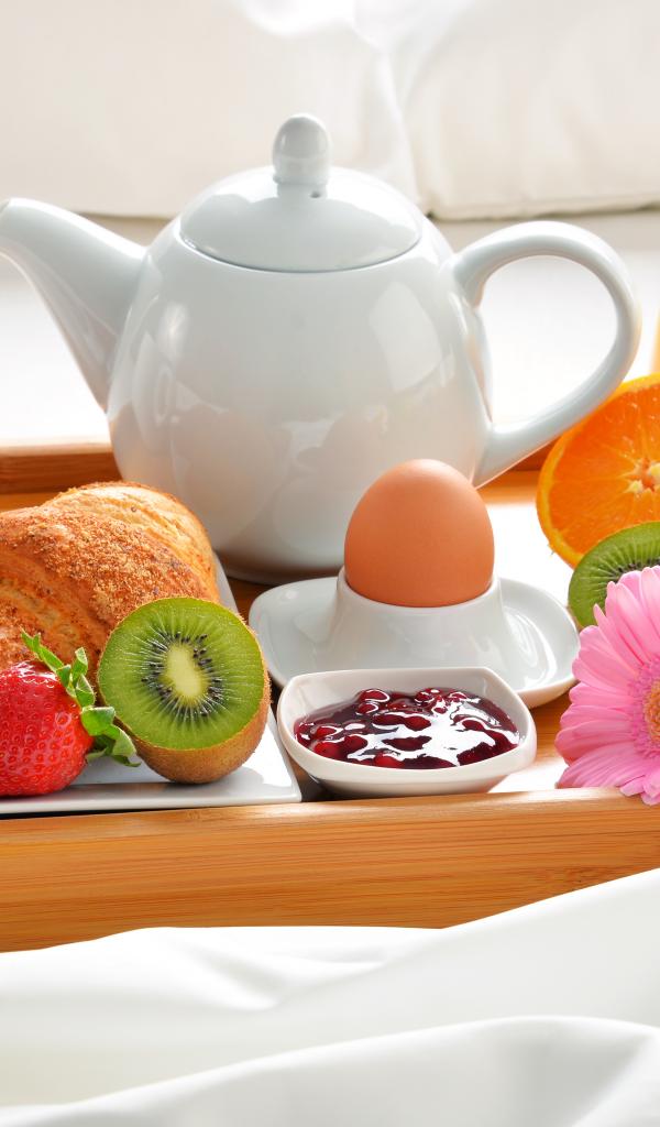 Обои Фрукты, круассаны, кофе и варенье на завтрак