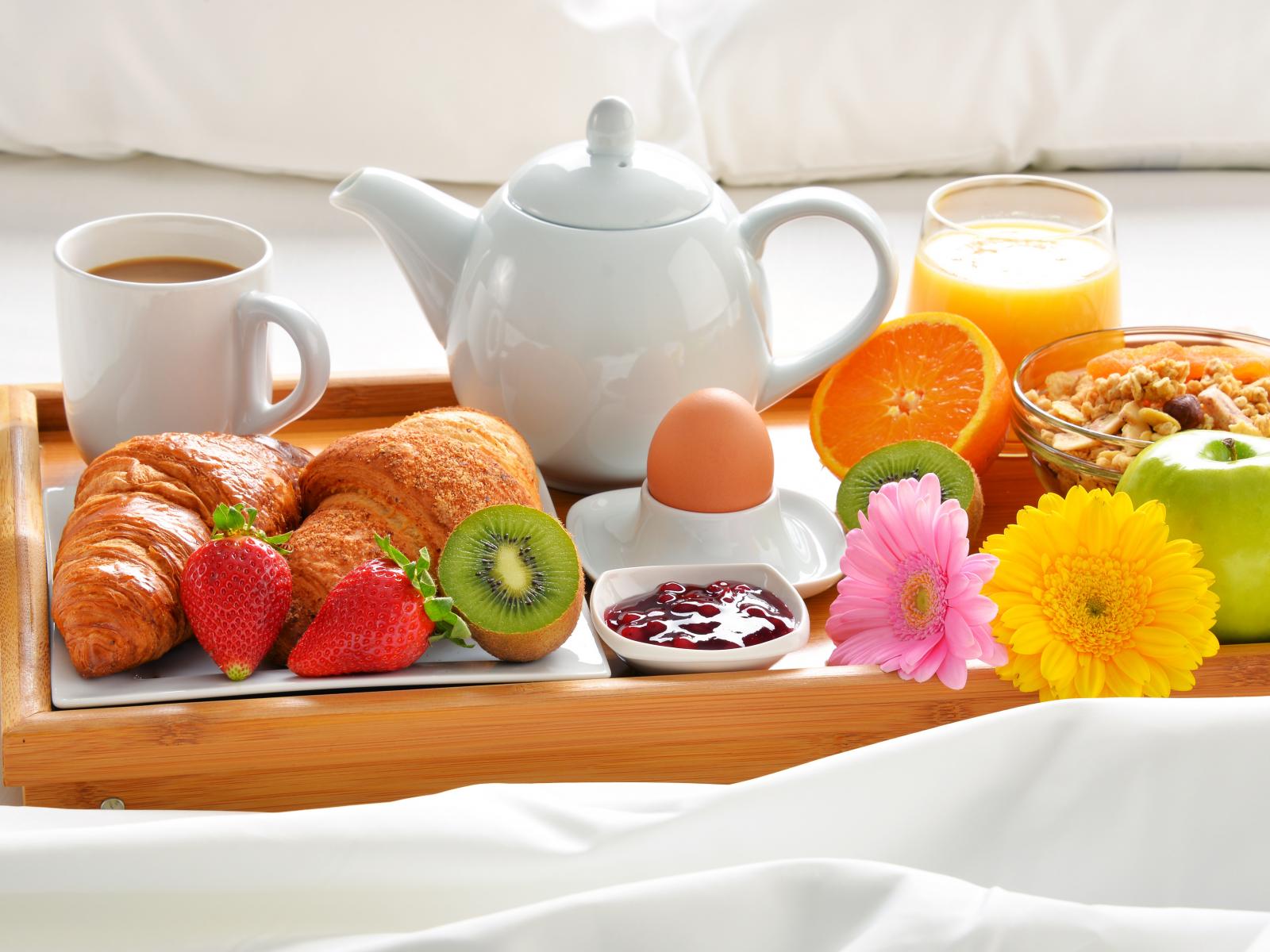 Обои Фрукты, круассаны, кофе и варенье на завтрак
