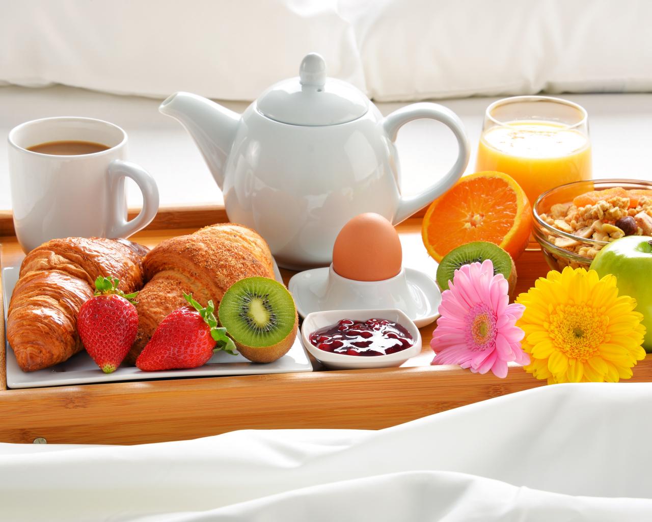Обои Фрукты, круассаны, кофе и варенье на завтрак