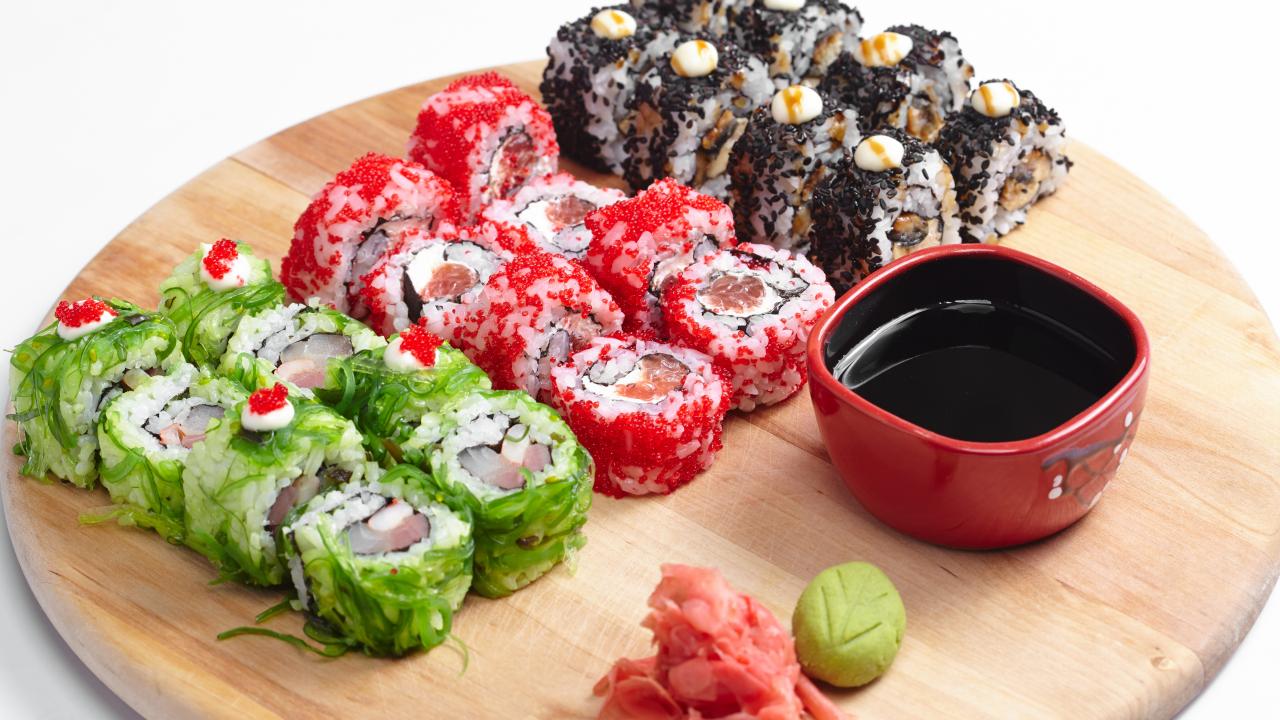 Обои Разные аппетитные суши на деревянной доске с соевым соусом