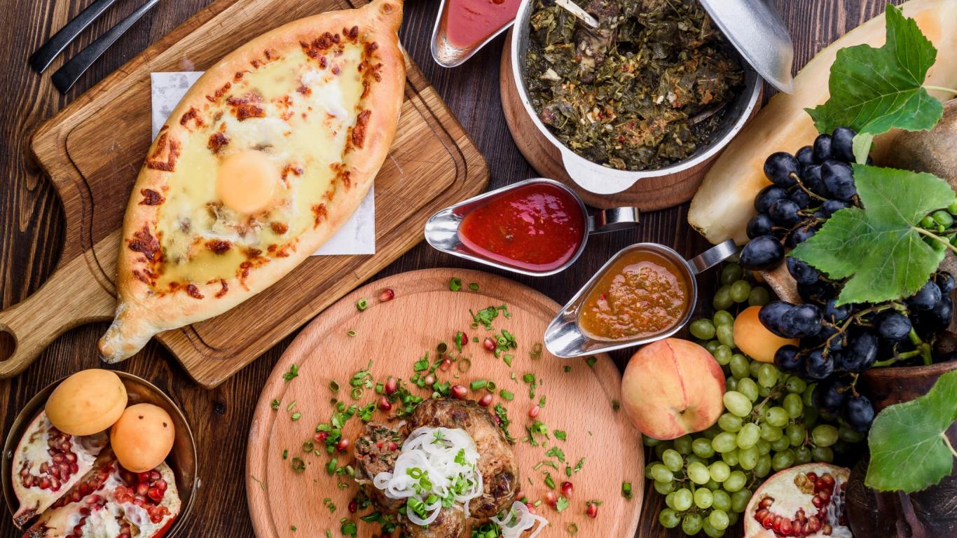 Обои Сытный обеденный стол с вкусными угощениями, натюрморт