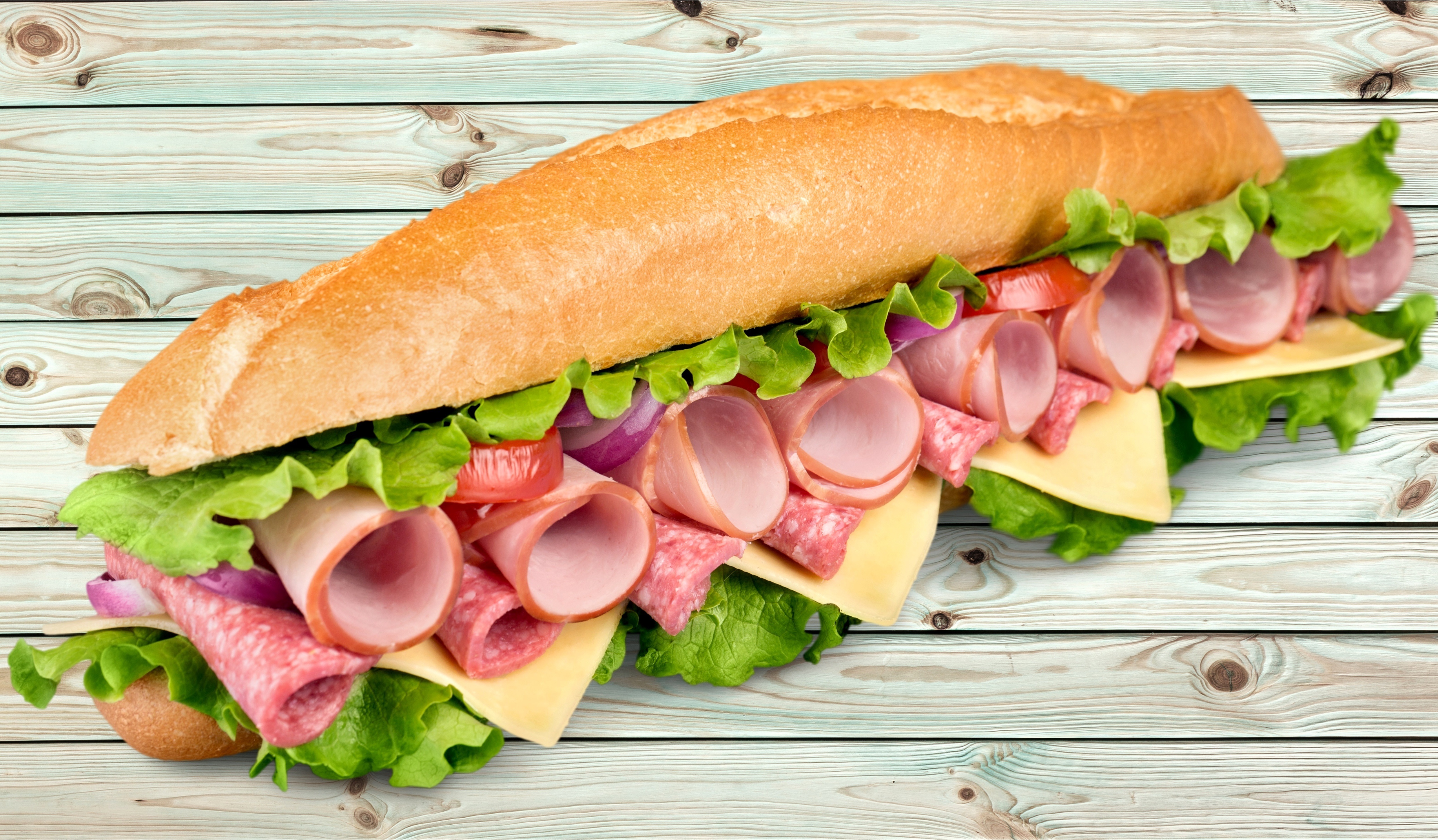 Обои Большой бутерброд с колбасой, сыром и листьями салата