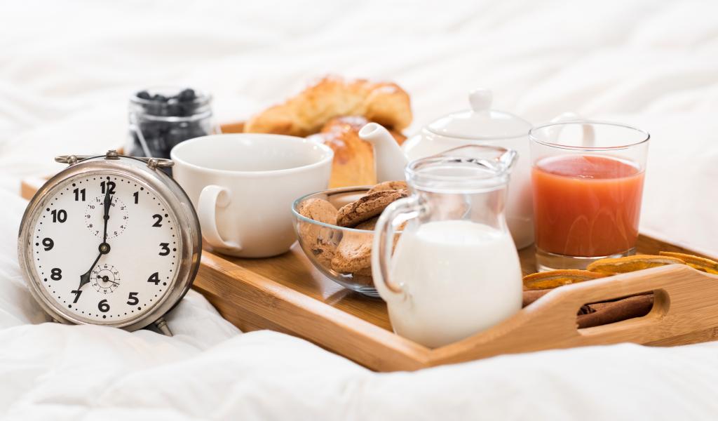 Обои Аппетитный завтрак в постель с будильником