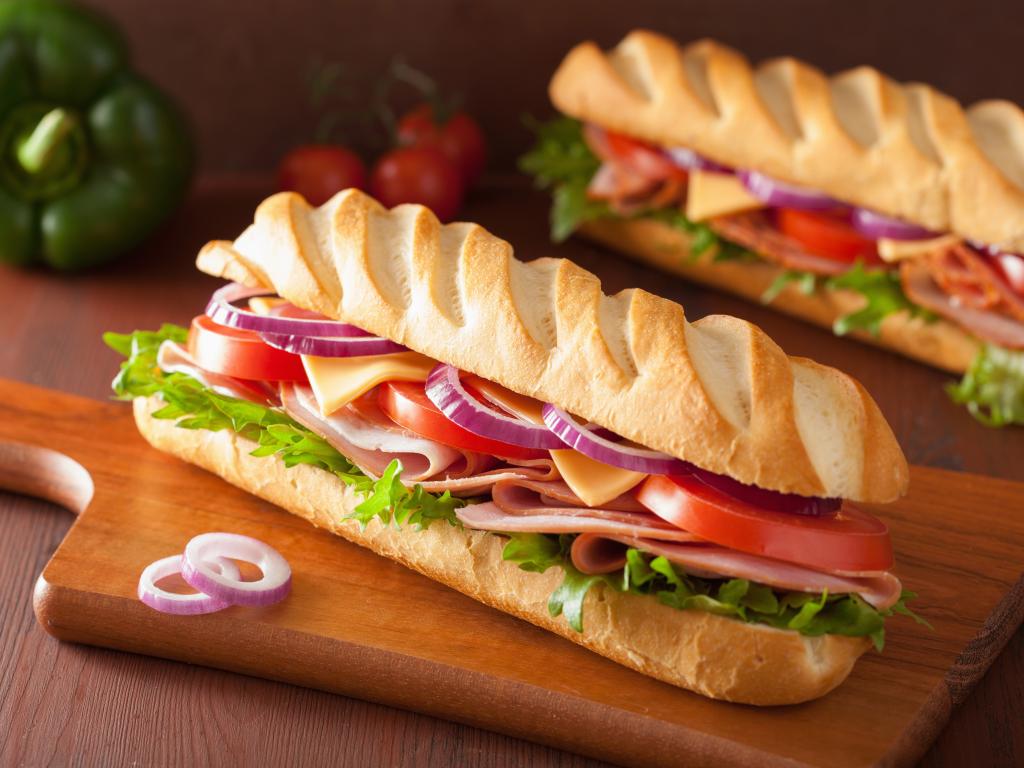 Обои Аппетитный сэндвич с ветчиной, листьями салата, помидорами и луком